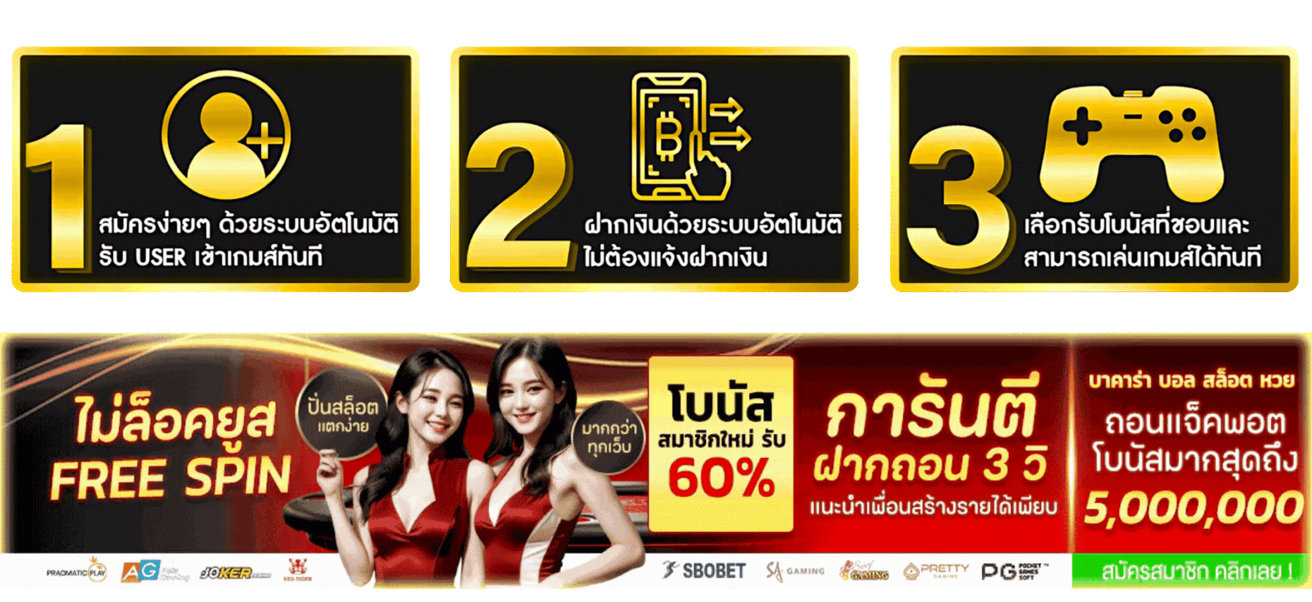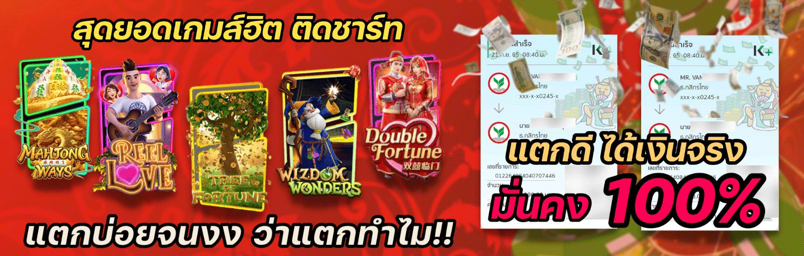 - โบนัสฝากแรก เช่น ฝาก 300 รับเพิ่ม 100 หรือฟรีสปินสำหรับเกมสล็อต